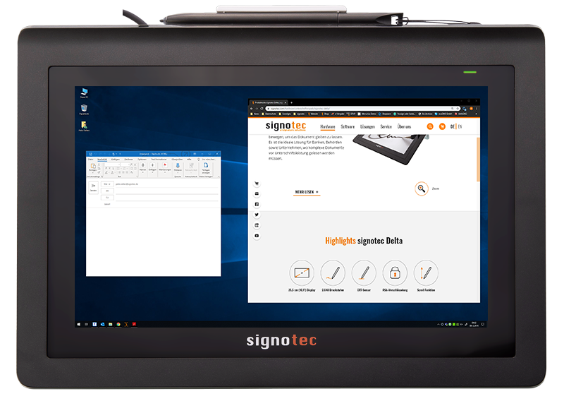 Monitoriaus plėtinys Signotec Delta Pen Display – tai 10,1 colio DisplayLink® monitoriaus plėtinys su rašikliu. Įrenginys komplekte turi integruotą stovą, todėl gali būti laikomas ant stalo tiek gulsčiai, tiek ir nuožulniai. Signotec Delta Pen Display prijungiamas per USB ir veikia kaip antrasis monitorius. Pagrindinį ekraną galima dubliuoti arba išplėsti per Windows monitoriaus nustatymus. Parašo fiksavimo programa rodoma įrenginio ekrane. Suderinamose programose rašiklis gali būti naudojamas ne tik parašams fiksuoti, bet ir pastaboms bei piešimui ar žymėjimui. Galima naudoti papildomą API, kad būtų galima gauti rašiklio koordinates ir slėgio duomenis. Ją taip pat galima naudoti norint atskirti pelės judėjimą nuo rašiklio įvesties.